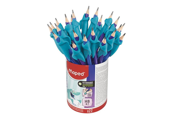 Το Maped Kidy Learn HB διαθέτει έναν εργονομικό οδηγό δακτύλων σε σχήμα καρχαρία, που βοηθά τα παιδιά να τοποθετούν σωστά τον αντίχειρα, τον δείκτη και το μεσαίο δάχτυλο.